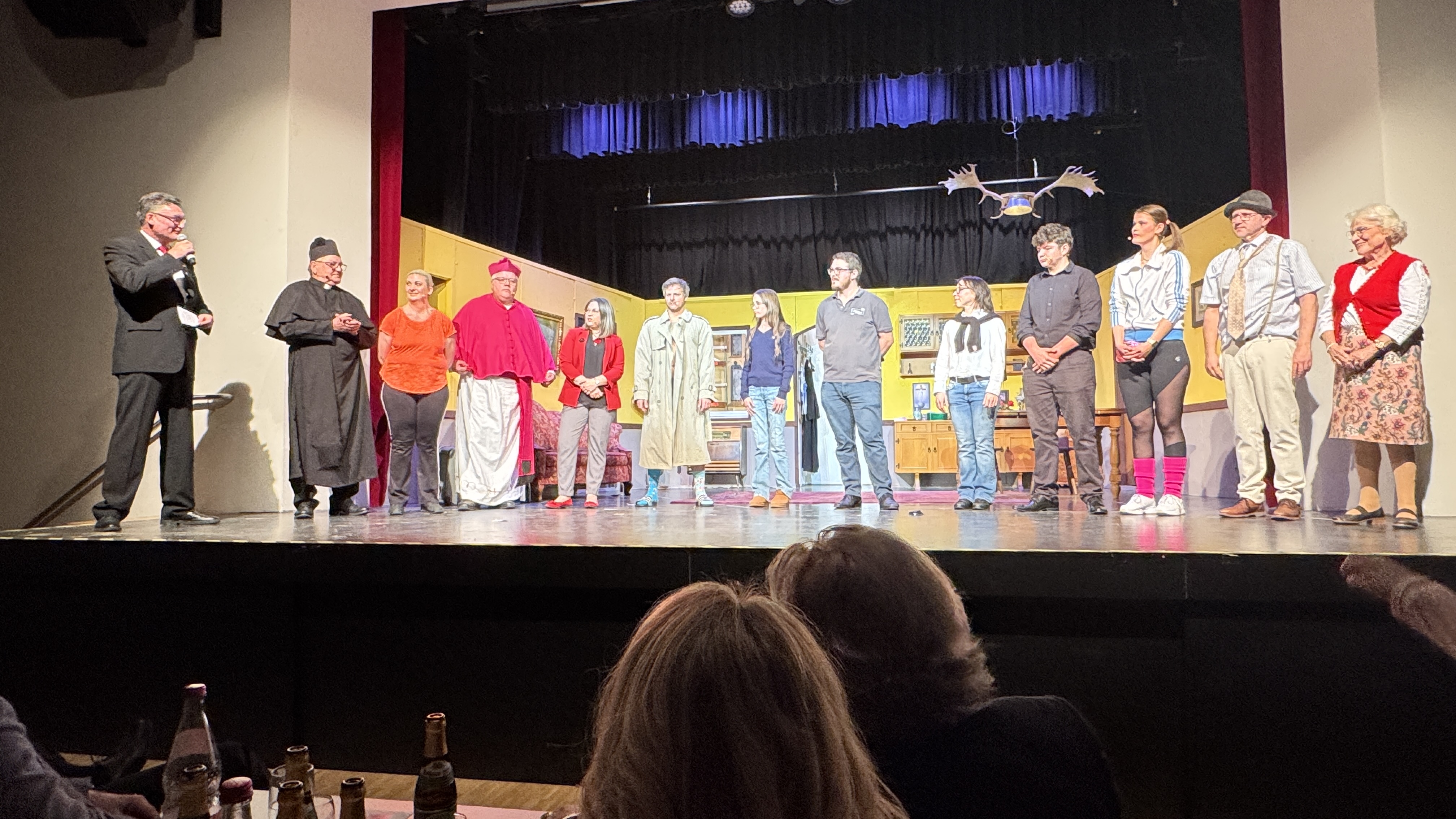 Im Anschluss übergab Vorstand Lutz Braun die Bühne dem „Woischlauchtheater“, auch dieses Jahr verstärkt durch Schauspieler befreundeter Ensembles. Unter der Regie von Tristan Julius Beyerer und Hannah Levicki führten sie den Dreiakter „Dem Himmel sei Dank!“ auf, eine unterhaltsame Komödie von Bernd Gombold, liebevoll für die lokalen Gegebenheiten aufbereitet vom Regieteam.