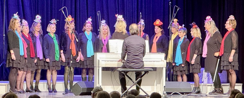 Ein Highlight des Abends war wieder der Auftritt der Damenformation „Die besseren Hälften“ mit Chorleiterin Annette Blatz-Braun. Die Sängerinnen, einige von ihnen Partnerinnen der MGV-Sänger, sind mittlerweile bekannt für ihre komödiantischen und farbenfrohen Arrangements. Beim Vortrag ihres fröhlichen „Lollipop“ klangen sie den Chordettes aus den Fünfzigern täuschend ähnlich. „Die Hefe“ des Musikkabarett-Trios „Die Mütter“ sorgte für manches Kichern, bevor dann die von Annette als Hommage an die inoffizielle Vereinshymne „Aus der Traube in die Tonne“ angekündigte Parodie „Von der Torte auf den Löffel“ Lachsalven und frenetischen Applaus auslöste. Das Outfit der Damen war, wie schon bei ihren früheren Auftritten, liebevoll auf diese Titel abgestimmt, mit selbstgebastelten Törtchen als Kopfbedeckung. Auch diesmal wurden sie virtuos begleitet von Pianist Thomas Lemke.