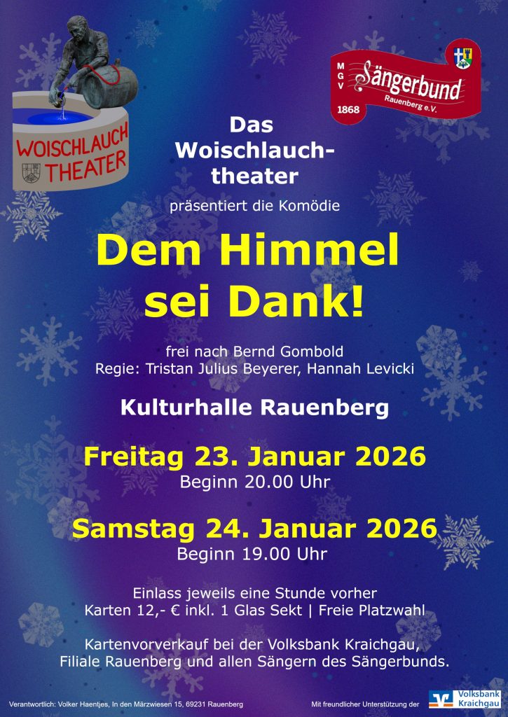 Für den 17. Januar 2026 freuen wir uns auf die traditionelle Winterfeier des Sängerbunds in der Kulturhalle mit der Premiere des Woischlauchtheaters und seinem neuen Stück „Dem Himmel sei Dank!“. Für diesen Termin sind noch wenige Karten erhältlich. Auch für Vierer- oder Sechsergruppen gibt es noch zusammenhängende Plätze.
