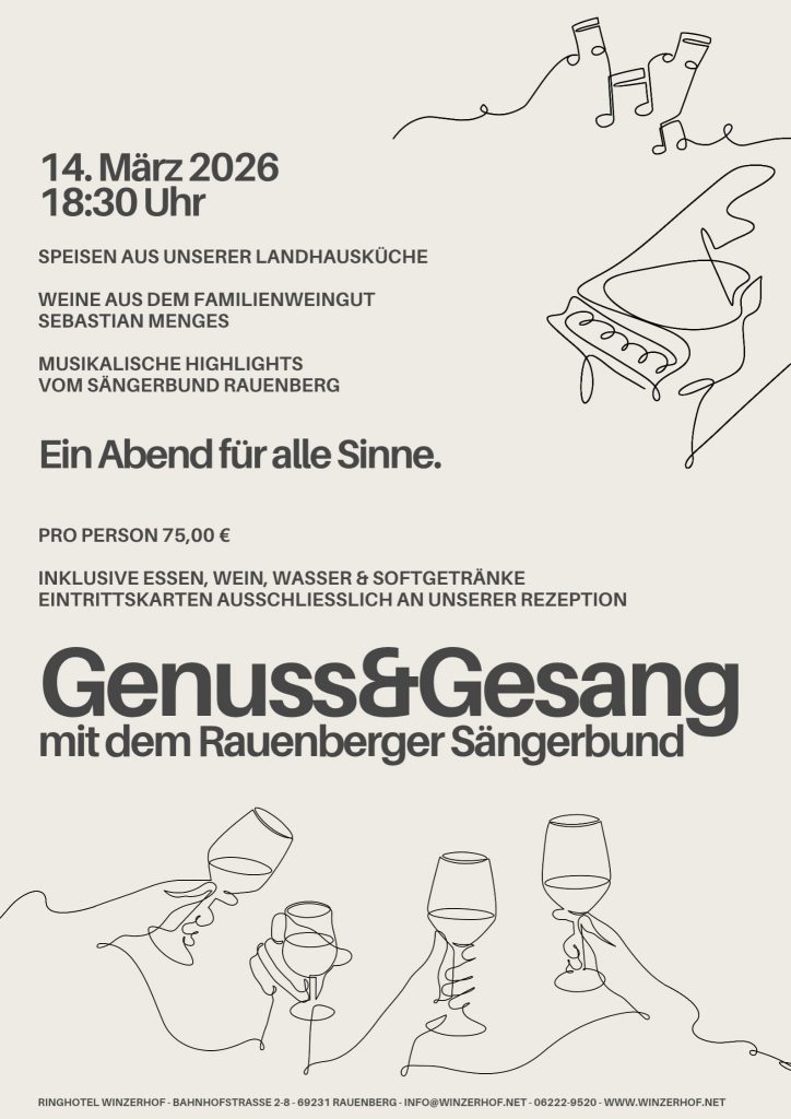 Am Abend des 14. März bietet sich die Gelegenheit, den Gesang des Sängerbunds in Kombination mit erlesenen Speisen und Weinen zu genießen, sozusagen ein Abend für alle Sinne. Der Sängerbund ist zu Gast bei Familie Menges im Winzerhof zu Rauenberg und freut sich darauf, den Abendevent „Genuss und Gesang“ musikalisch zu begleiten. Eintrittskarten sind exklusiv an der Rezeption des Winzerhofs erhältlich. Mehr dazu gibt’s auf der Website des Winzerhofs.